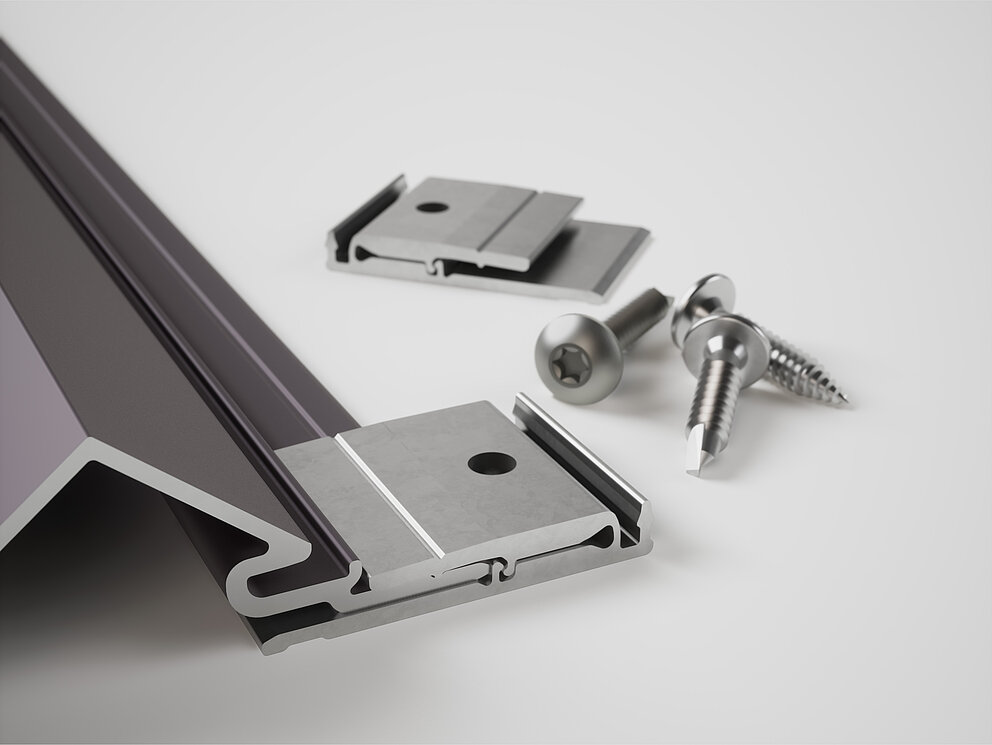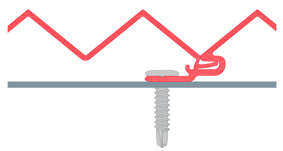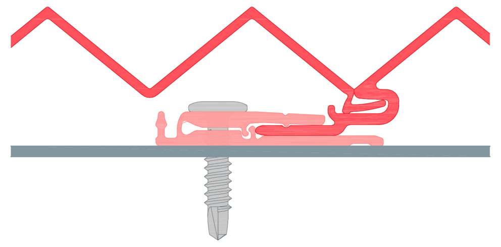 Skrito pritrjen montažni sistem na pero in utor za valoviti profil in nazobčani profil je sestavljen iz pomičnega sidra in posebnega vijaka za leseno, jekleno in aluminijasto podkonstrukcijo.