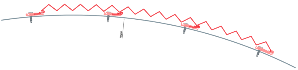 Ekstrudirano stiskane profile PREFA je mogoče montirati tudi pri navpičnem polaganju profilov na zaokroženi podlagi. Pri tem je za gradbeno širino 200 mm treba upoštevati najmanjši radij r ≥ 1.250 mm.