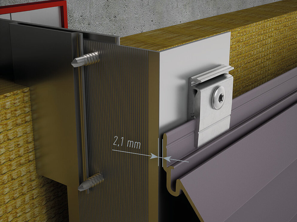 Če so profili montirani s pomičnim sidrom, je nujno paziti, da je pomično sidro uporabljeno tudi na fiksni točki. Le tako ostane ohranjena razdalja do nosilnega profila podkonstrukcije, ki je določena z gradbeno višino pomičnega sidra 2,1 mm. Pri tem se posebni vijak ne vodi skozi vnaprej izbito vrtino, temveč se ga namesti v spodaj ležeči vrtalni kanal, ki ga je treba predhodno zvrtati s kovinskim svedrom Ø 3,0 mm.