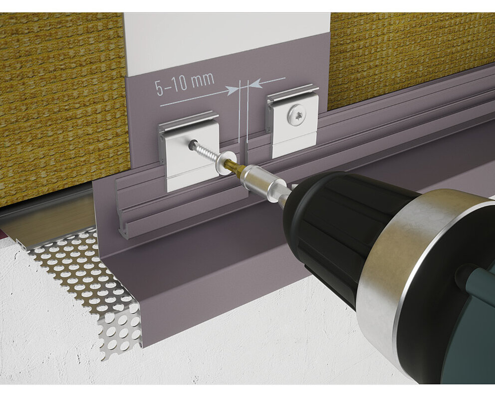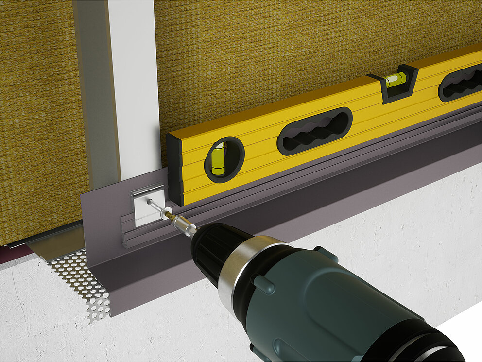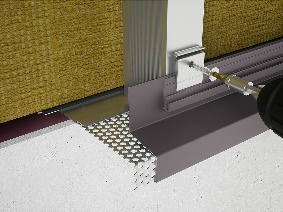 Ko so priključne priprave za območje podzidka VHF (perforirana pločevina in pokrivni trak) nameščene, se lahko montaža začne z začetnim profilom. Začetni profil je vedno prvi profil za izvedbo fasade iz ekstrudirano stiskanih profilov.
