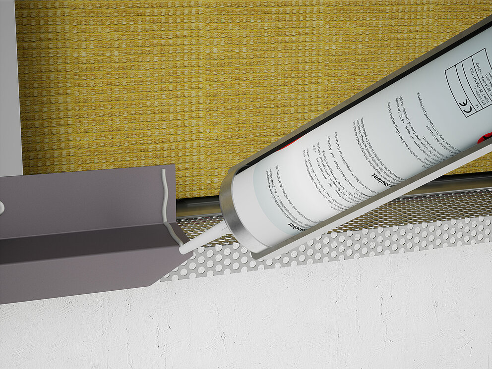 Ko je podkonstrukcija zaključena, začnite z montažo vtične letve, pokrivni trak, perforirano ploščo in odkapni profil. Spoje odkapnega profila oblikujete s prekrivanjem in lepljenjem. Spodaj ležeči (skriti) odkapni profil je zarezan tako, da je mogoče namestiti zgoraj ležeči odkapni profil.