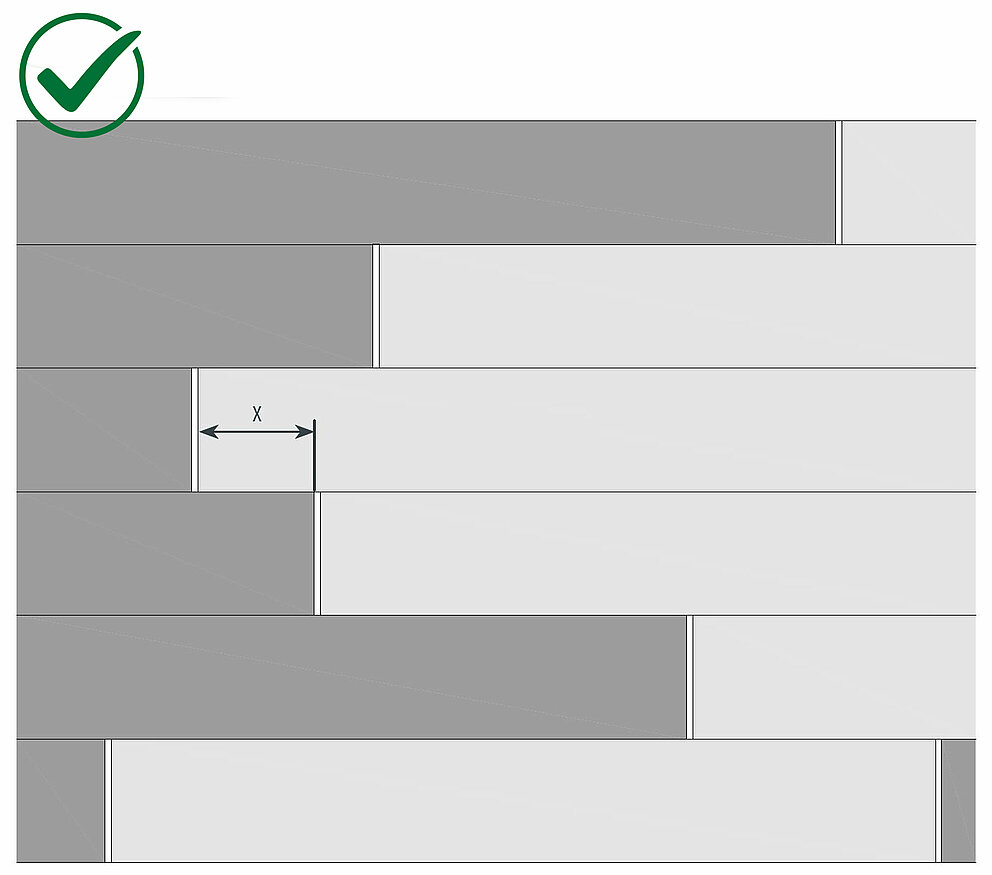 PREFA priporoča, da zamik (x) znaša najm. razdaljo, ki ustreza položeni gradbeni širini (BB) (npr. za Siding 138×0,7 mm = najmanjši zamik 138 mm):