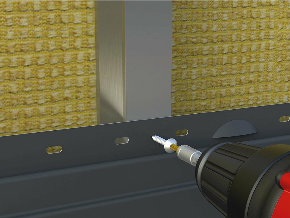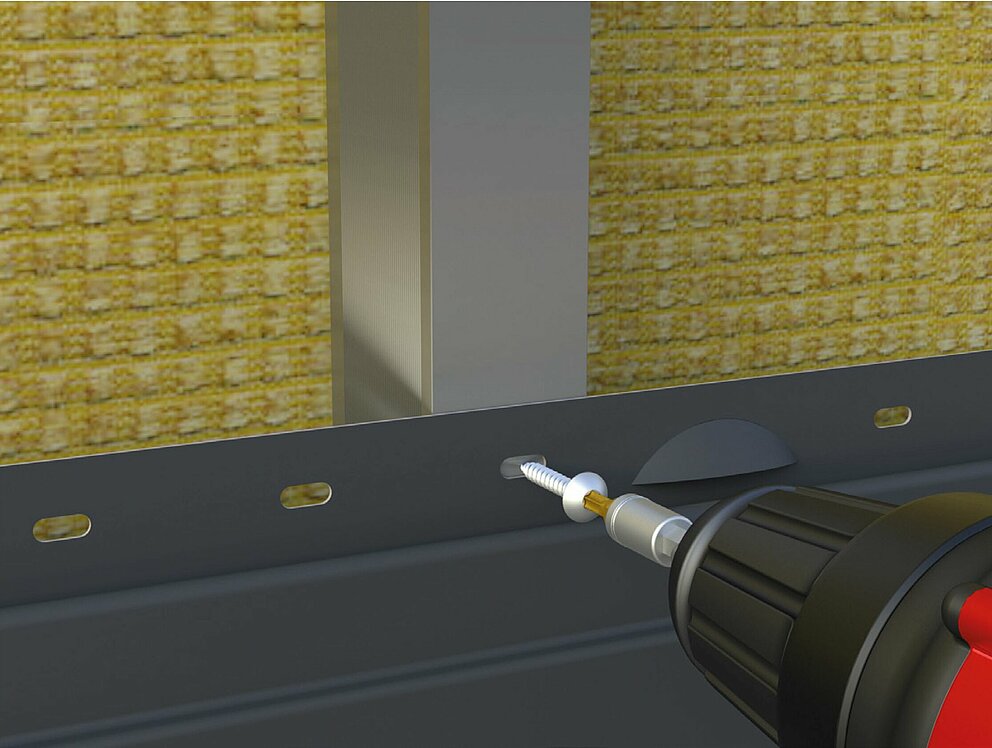 Pritrdilni vijak privijte sredinsko skozi vnaprej izbito vzdolžno odprtino na pritrdilnem traku v nosilni profil. Če neposredno nad nosilnim profilom podkonstrukcije ni vnaprej izbite vzdolžne luknje, morate npr. s pomočjo klešč za dolge luknje ustvariti dolgo luknjo, da omogočite neomejeno raztezanje elementov Siding.