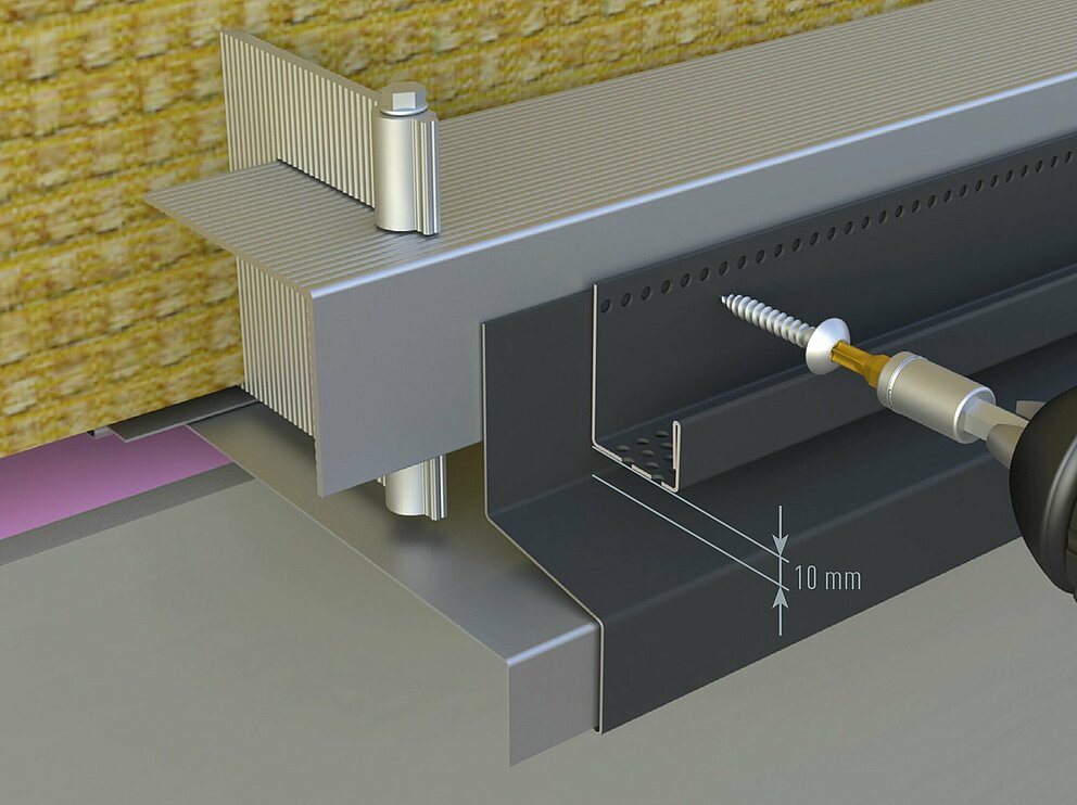 V primeru fiksne točke vrtalni vijak privijete neposredno skozi začetni profil oz. perforirano zaslonko. Za določitev drsne točke s kleščami za utore izbijte želeno vzdolžno odprtino.