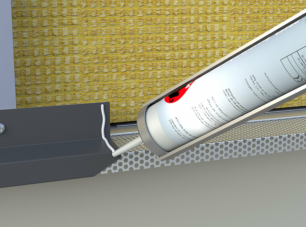 Ko je podkonstrukcija zaključena, začnite z montažo vtične letve, pokrivni trak, perforirano ploščo in odkapni profil. Spoje odkapnega profila oblikujete s prekrivanjem in lepljenjem. Spodaj ležeči (skriti) odkapni profil je zarezan tako, da je mogoče namestiti zgoraj ležeči odkapni profil.