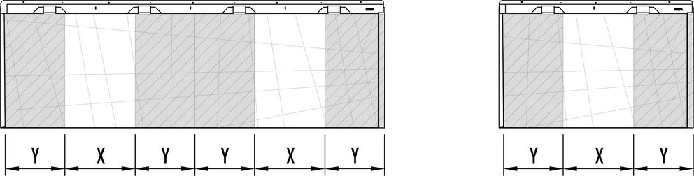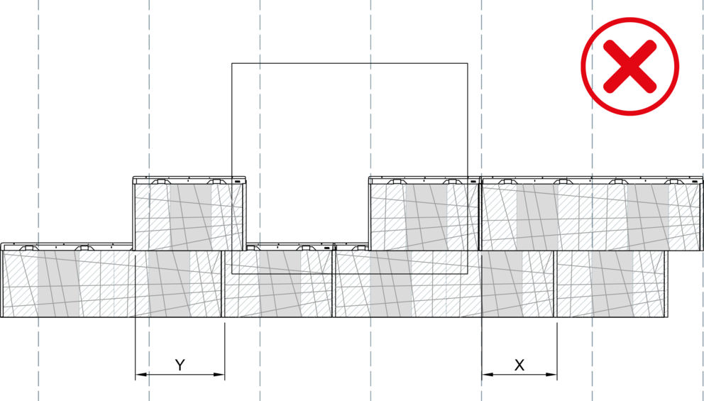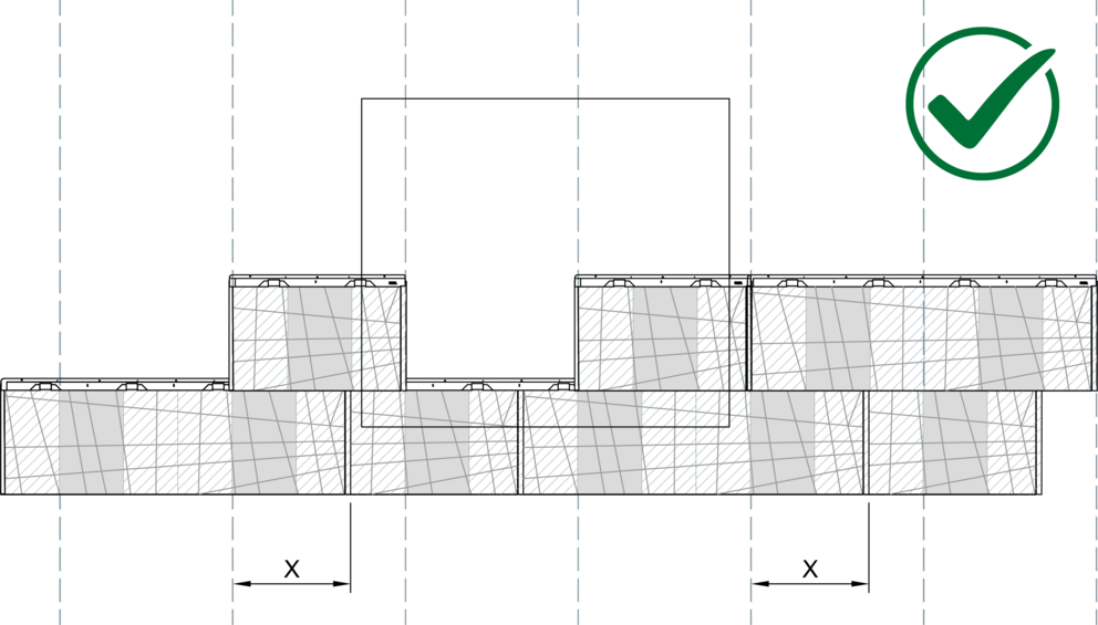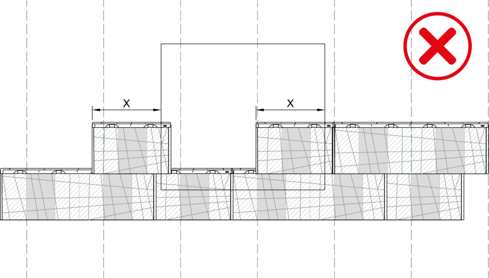When installing FX12 facade panels no vertical seam must lie on top of each other, a lateral offset of 220 mm has to maintained. When combining large and small FX.12 panels, the joint of the first panel must be started in area “X” for each new row.