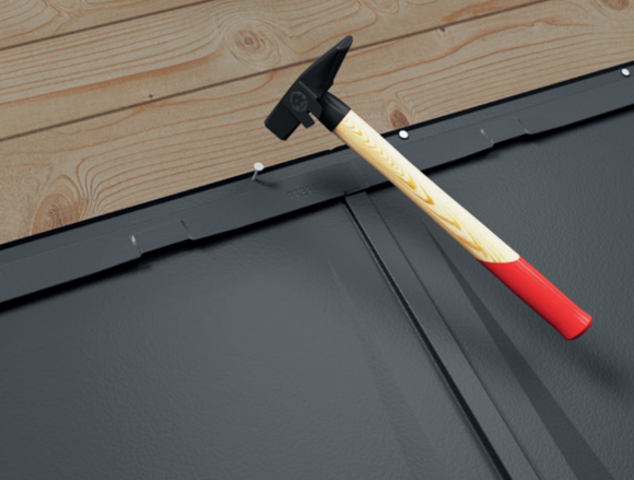 Adjust R.16 roof tile and push into the folds. Strike the bottom edge of the panel lightly with the handle of the hammer.