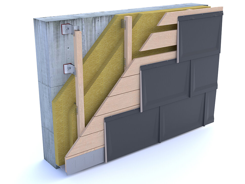 The solar roof panel on the façade can also be installed on skip sheathing (at least 24 mm). When installing on a open gap boarding a board must be placed under each fastening strip with a spacing of 420 mm to be achieved.