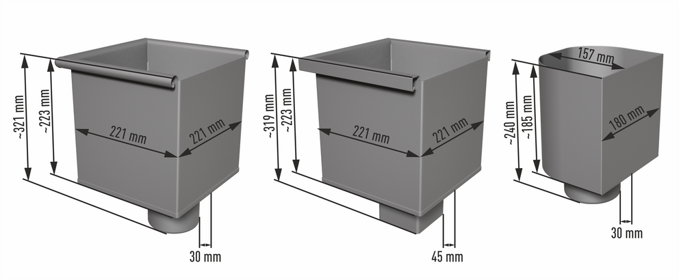 Razmik med izpustno cevjo PREFA in fasadno površino mora biti najmanj 20 mm. Pri uporabi kvadratne cevi upoštevajte razmik med steno in kvadratno cevjo najm. 45 mm.