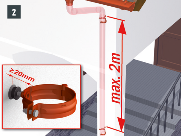 Cevne objemke je treba montirati tako, da je upoštevana najm. 20 mm razdalja med zadnjo stranjo cevi in fasado. Razmik med cevnimi objemkami ne sme biti večji od 2 m. (Nacionalni standardi in strokovna pravila lahko dovoljujejo večje razmake. Zaradi dolžine padne cevi PREFA 3 m se je kot praktičen izkazal največji razmak 2 m.)