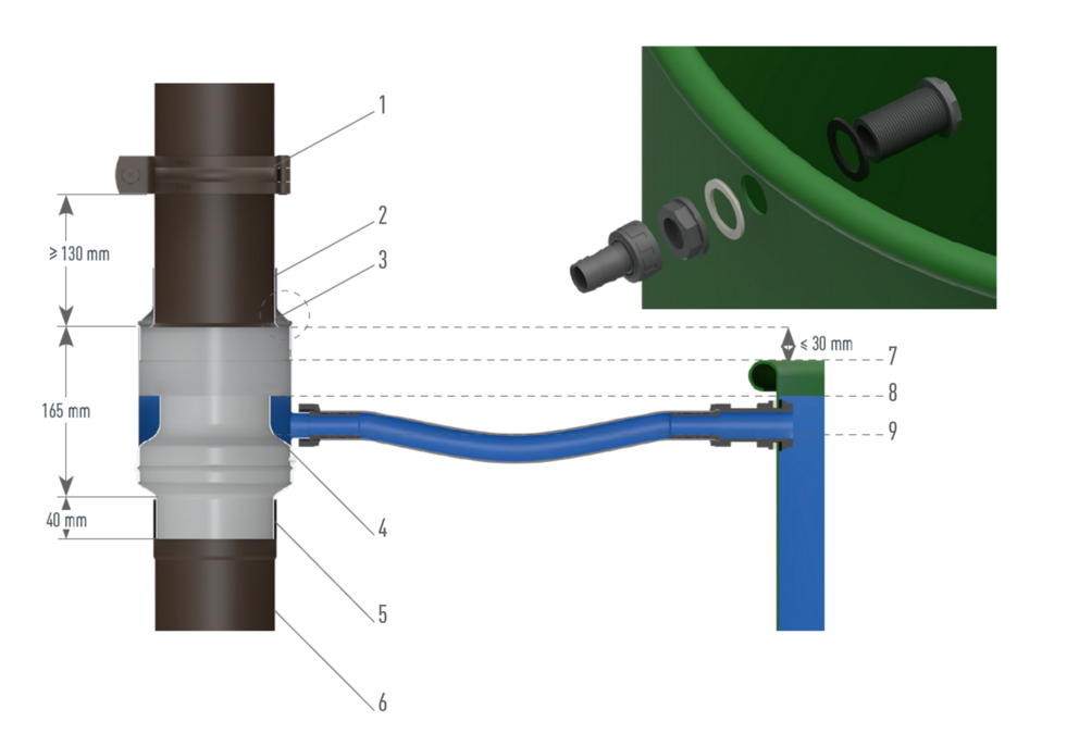 Pri lovilcu vode se sod za deževnico ob dežju napolni z deževnico neposredno prek izpustne cevi in zbira vodo do želene višine.