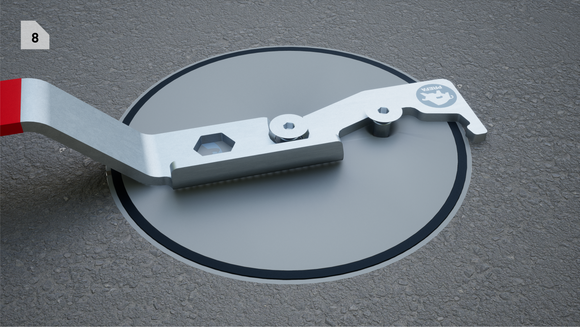 - Odpiranje pokrova z možnostjo zaklepanja (2 vijaka): S 6-mm notranjim šestrobim ključem odvijte vijaka za pribl. 1 cm, sredinski vijak vrtite naprej, dokler upora ni več čutiti, nato vstavite orodje za dvigovanje, ga zavrtite za 90° in dvignite navzven.