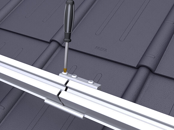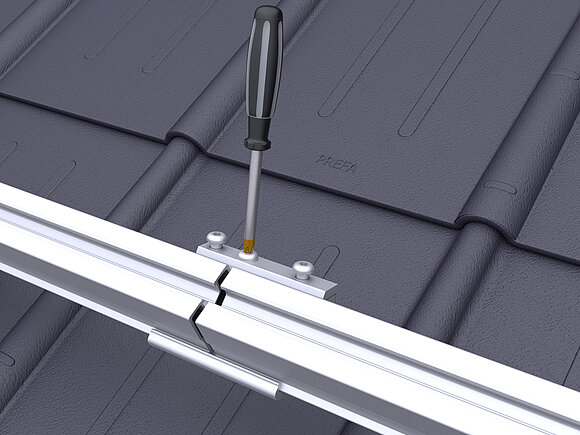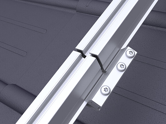 The rail connector must be installed so that the fixing screws are on the ridge side of the rail. The engraved spacing between the two rails must be observed to allow for temperature-related expansion of the individual rails.