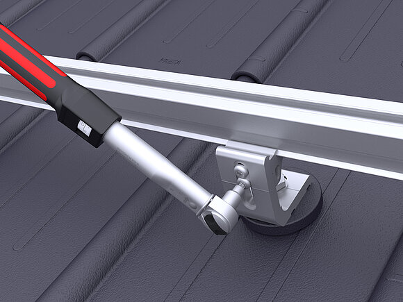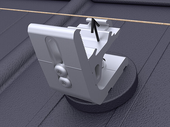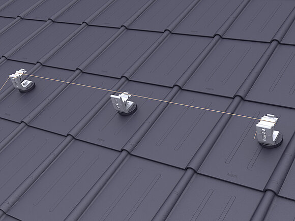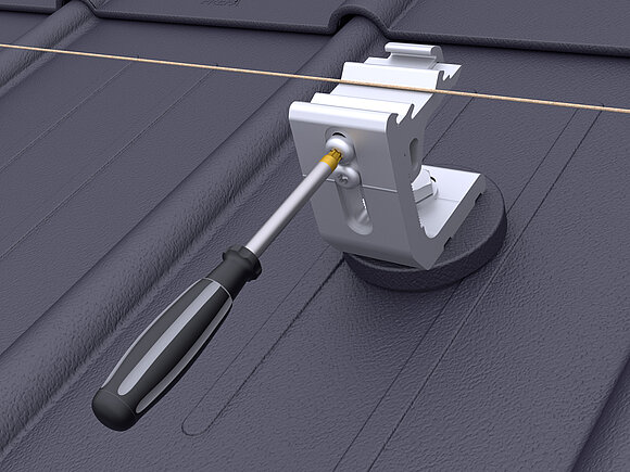 Adjust the rail holders of the outer PREVARIO 3.S units to mid-height. Tension the installation line and align the remaining rail holders parallel to the roof and in height. Tighten the upper screw of the already aligned rail holders with a torque of 20 Nm.