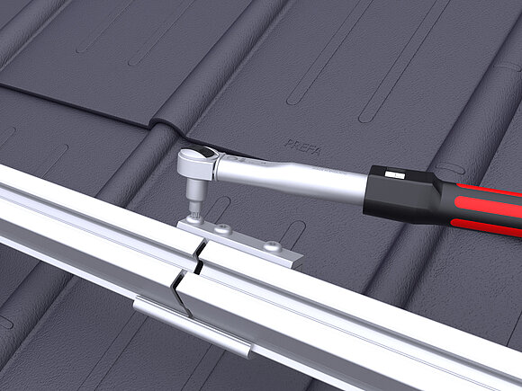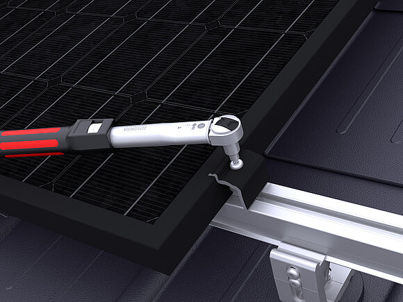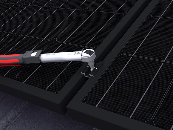 The modules are then positioned, and mid and end clamps are tightened with a torque of 15 Nm.
