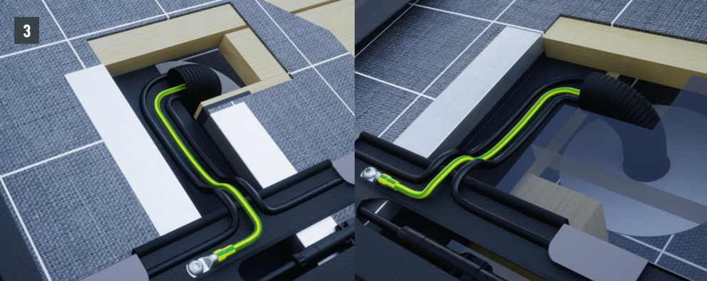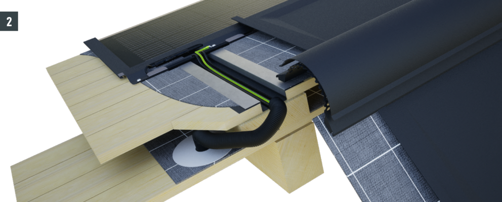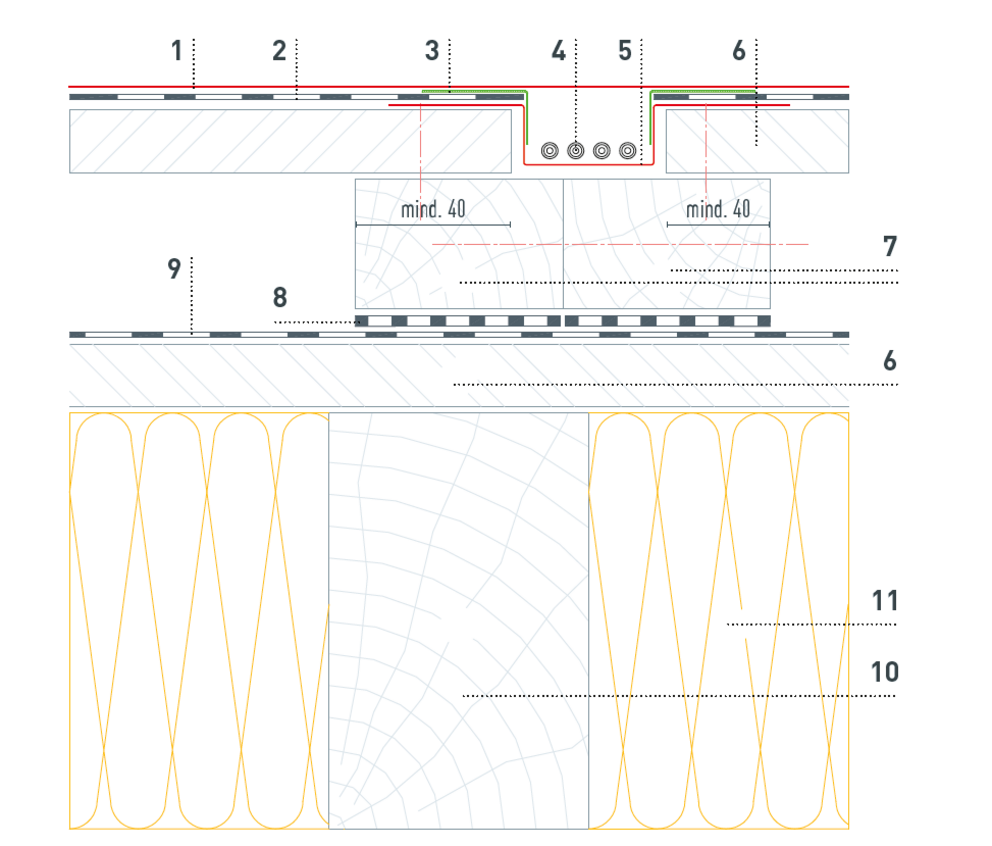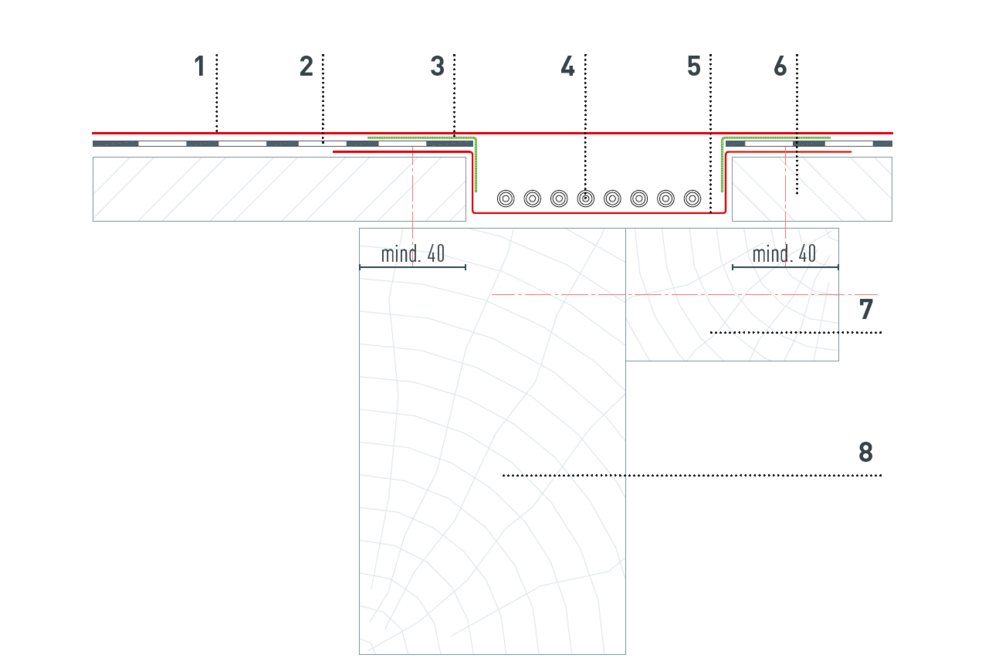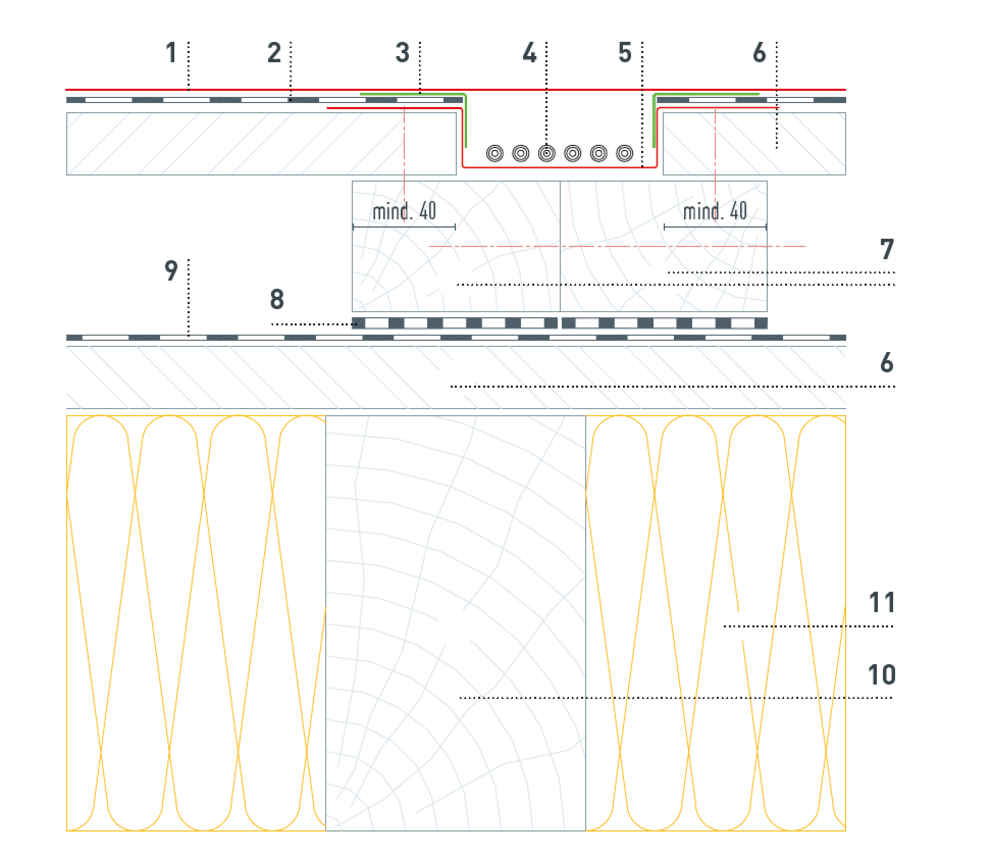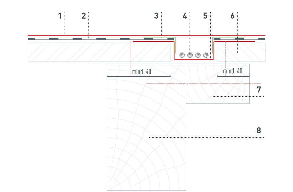 Due to the necessary cable routing, the timber supporting substrate must be made according to the following details. The number and position of cable ducts are defined by PREFA’s Product Technology department and displayed in the PV installation plan.
