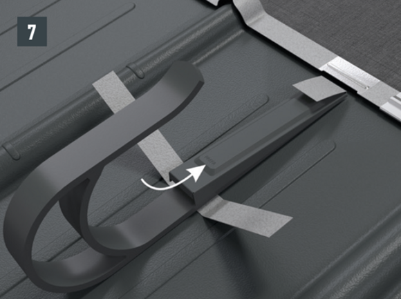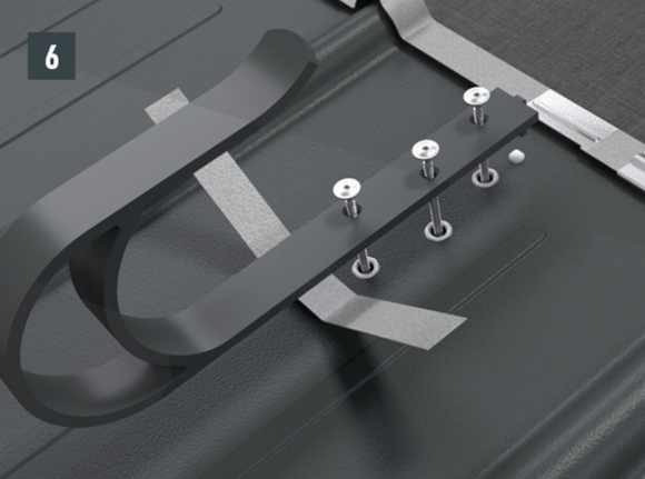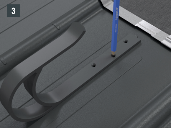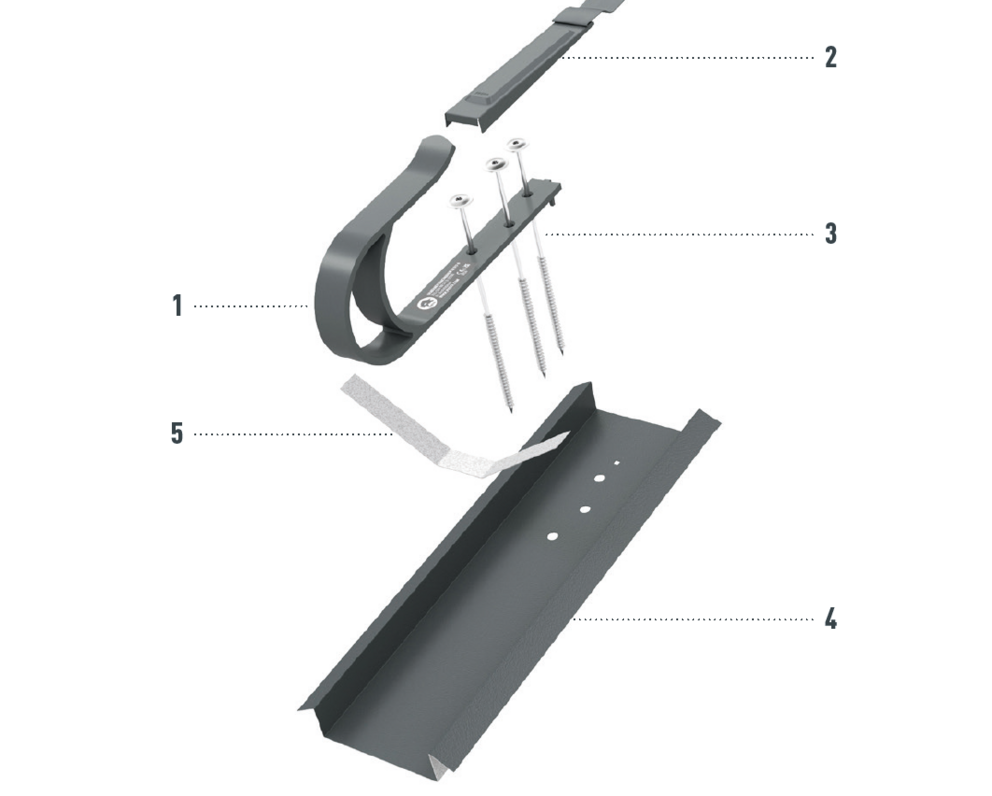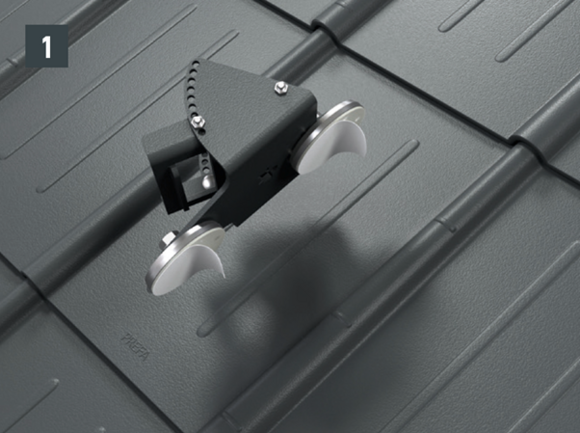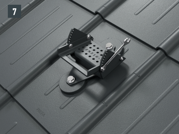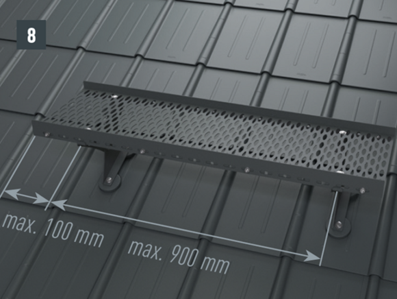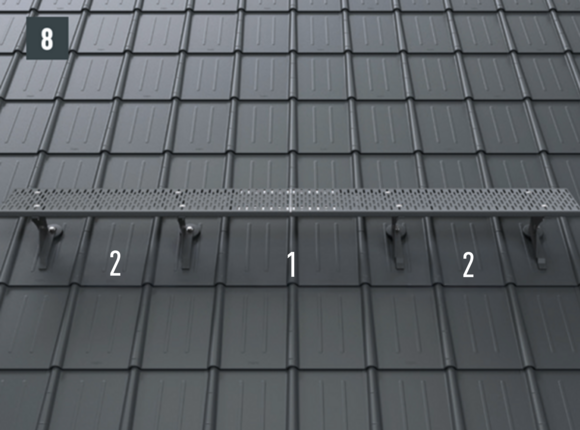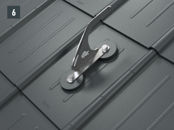 Upoštevajte smernice za montažo PREFA, veljavne standarde in strokovna pravila. Varnostne strešne kavlje je treba namestiti na sredini v špirovce s pomočjo priloženih vijakov.
