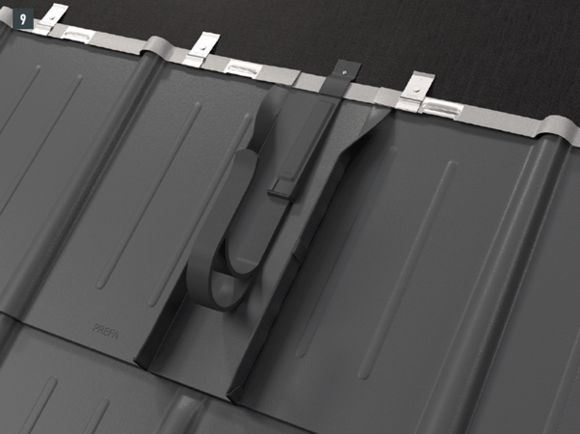Pri vseh strešnih sistemih PREFA bo morda potrebno namestiti podložno ploščo (npr. če se zgib ali dvignjen del vala nahaja v območju špirovcev). Varnostne strešne kavlje na pritrdilnih podlagah ne namestite in pritrdite na zgib ali dvignjen del vala kritine PREFA.