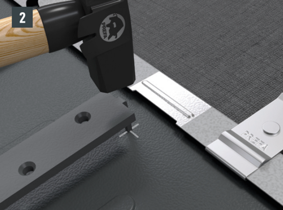 Osnovna pogoja sta v skladu s smernicami/strokovnimi pravili položen strešni sistem PREFA na polnem opažu debeline najm. 24 mm in statično nosilna podkonstrukcija. Razdalja med špirovci lahko znaša največ 1.000 mm. Nosilec pohodne rešetke je treba s priloženimi pritrdilnimi podlagami namestiti na opaž. |