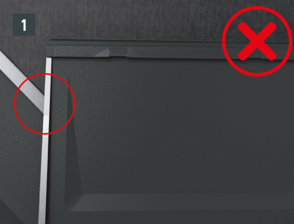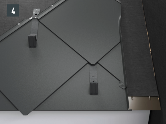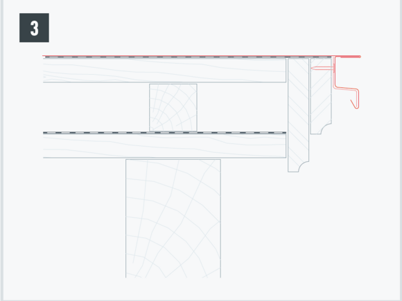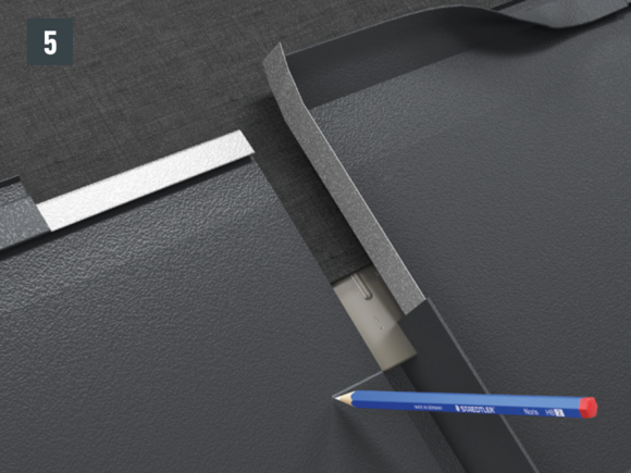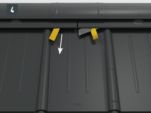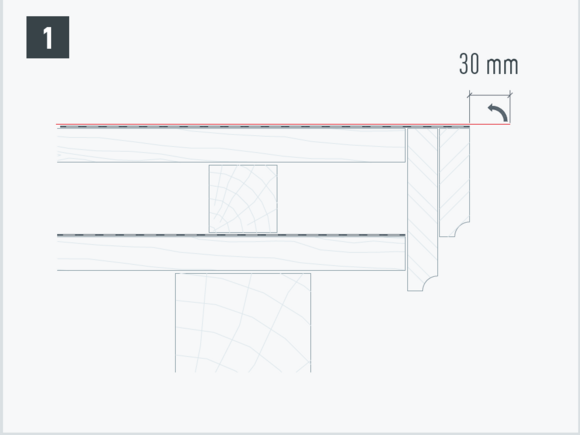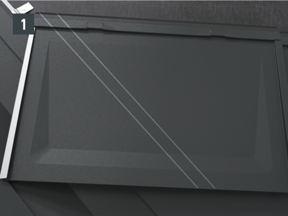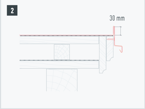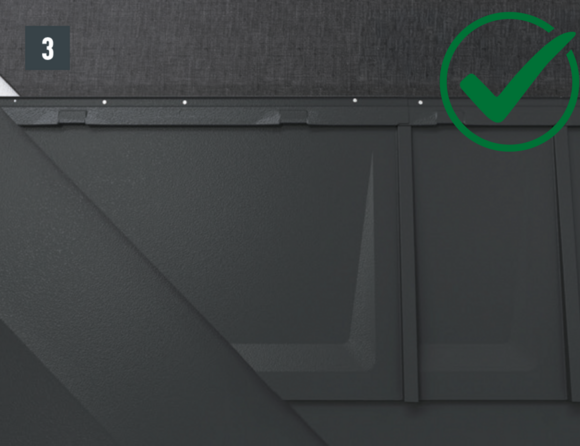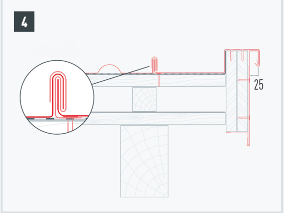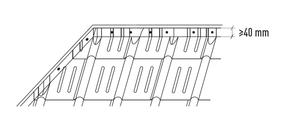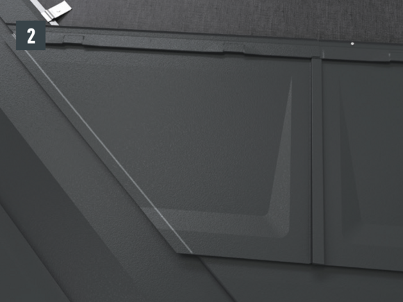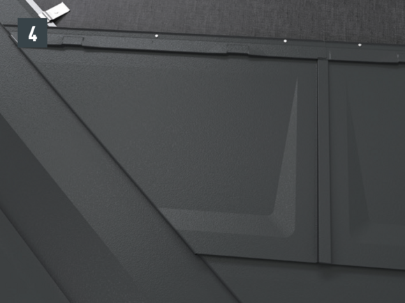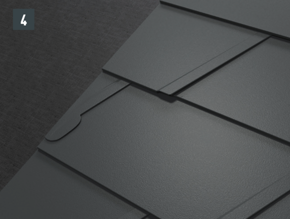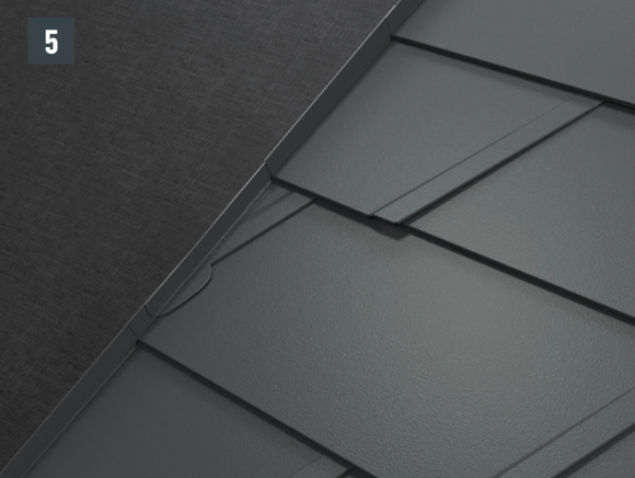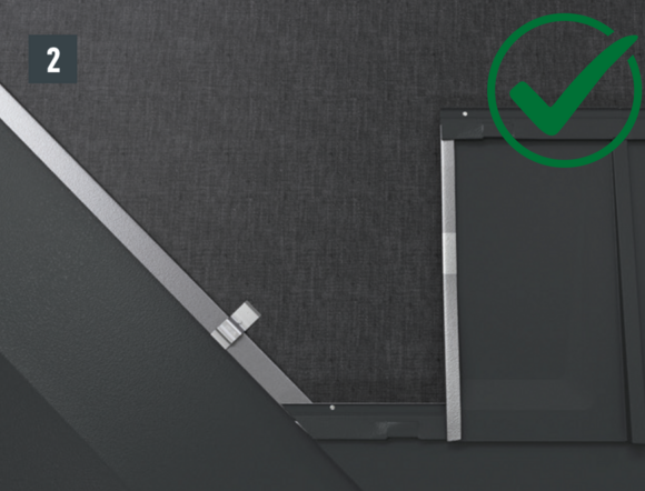 Tukaj je treba upoštevati, da se območje za stranski zaključek (npr. izdelava čelnega napušča) ne nahaja na območju zgiba strešne plošče R.16 oz. strešnega panela FX.12. Po potrebi začetni trak zamaknite za eno četrtino dimenzije strešne plošče R.16 oz. strešnega panela FX.12.