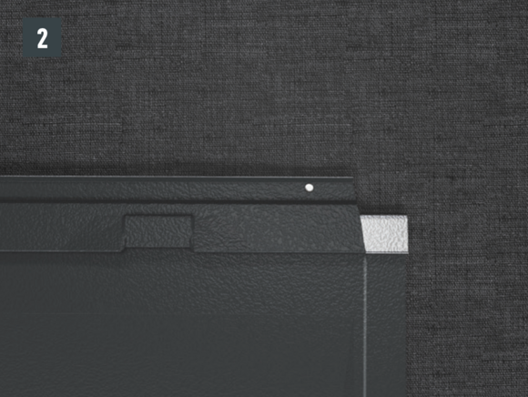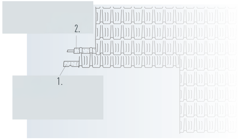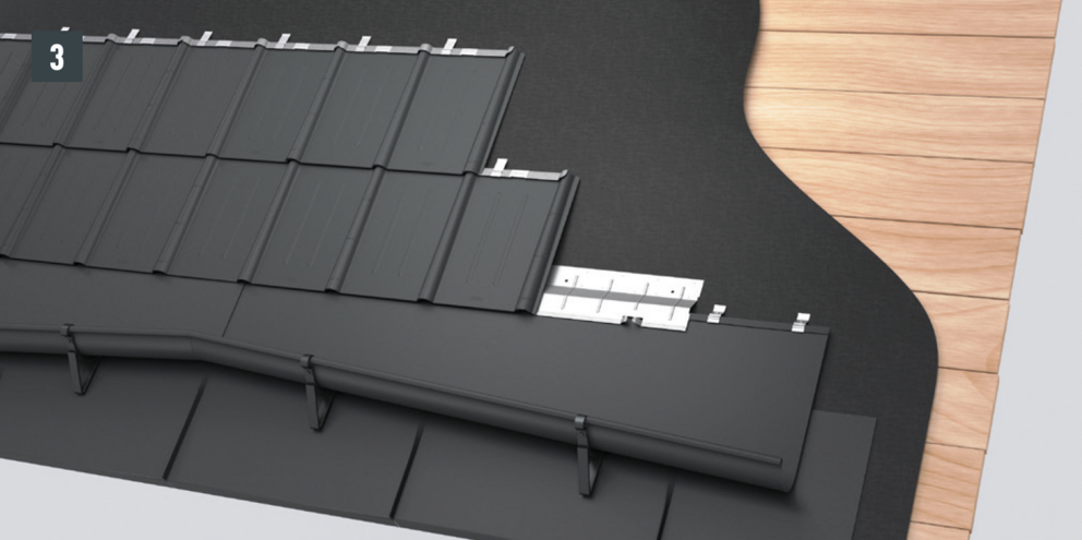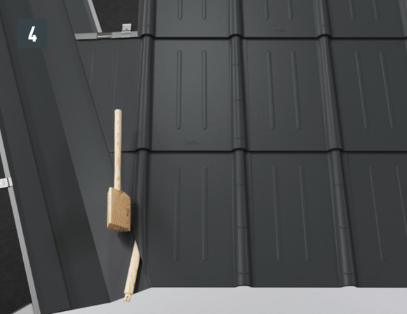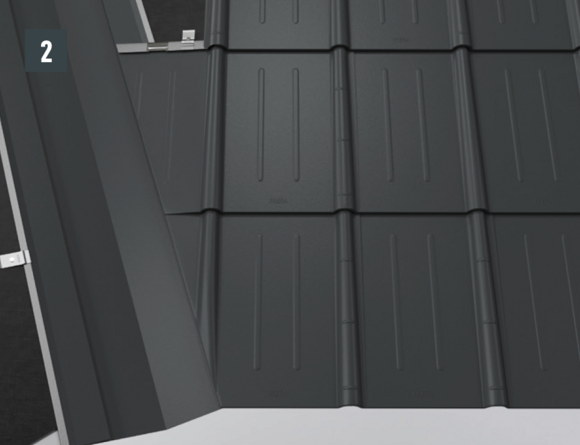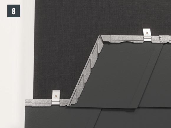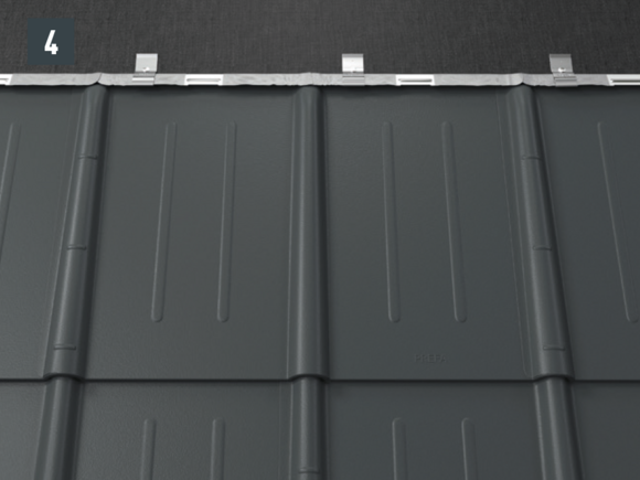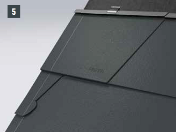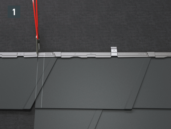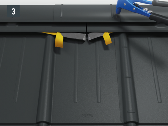 Zadnjo (po potrebi prirezano) vrsto plošč s povratno pritrditvijo prek neposredne pritrditve stransko pritrdite na dvignjen del vala spodnjega vala (pri strešnih ploščah PREFA) ali z neposredno pritrditvijo nad penasti klin Jet zračnika.