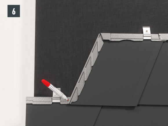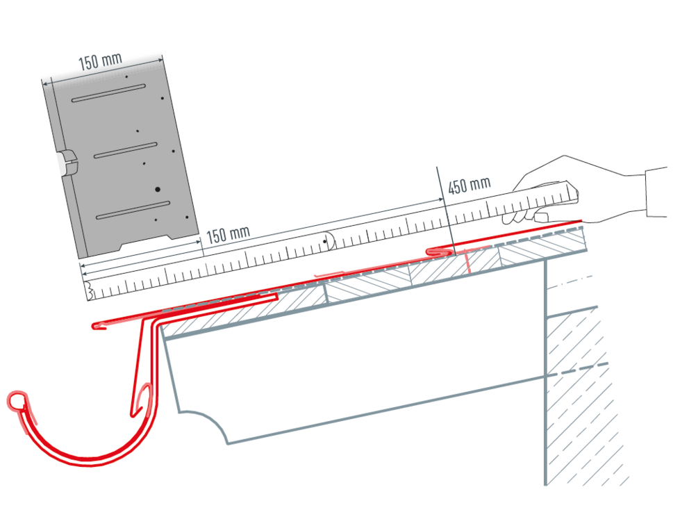 Od zgornjega roba prve strešne plošče izmerite 450 mm v smeri napušča (pazite na to, da se previs napušča nahaja med 30 in 80 mm). Za 150 mm (širina začetnega traku) od spodaj naredite oznako (= zgornji rob širine začetnega traku).