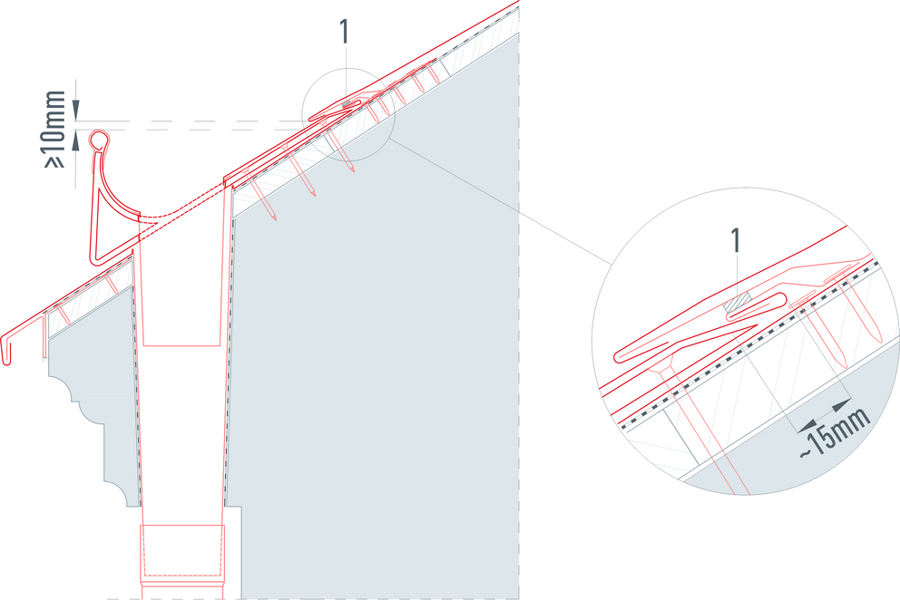 Pri vsakem levem zaključku strešne skodle DS.19 (trak za čelni napušč in okvir) je treba izrezati zgibe, ki potekajo prečno navzdol, da se prepreči kapilarno delovanje.