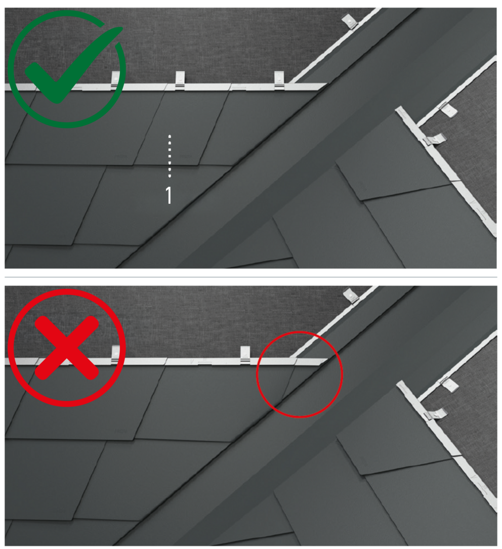 Če se presečišče žlote/spoja skodle združuje na levi strani glede na žloto, je treba pri strešnih skodlah predhodno izdelati in namestiti skrajšano strešno skodlo (1) oz. skodlo za zaključek (1).