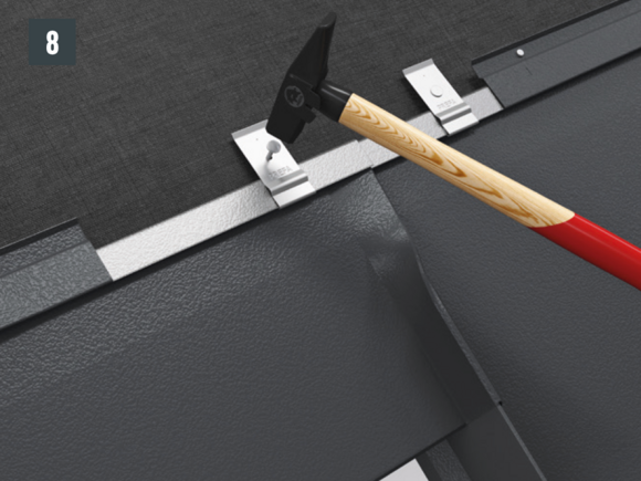 Namestite skodlo za zaključek, razrežite z dodatkom zgiba 30 mm in usmerite navzgor (slika 8 in 9).