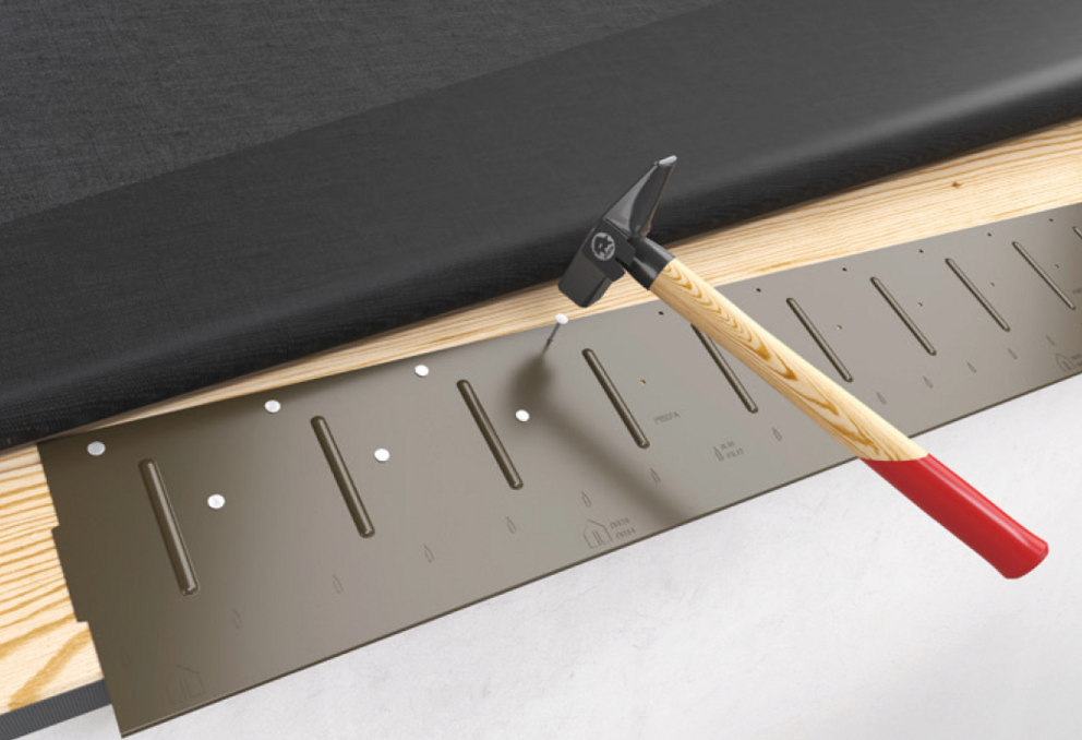 Začetni trak je treba pribiti tako, da je zaščiten pred nevihtami (žeblje pribijte v vse predhodno izrezane luknje). Začetni trak v celoti pritrdite, preden v vse predhodno izrezane luknje pribijete priložene žeblje PREFA.