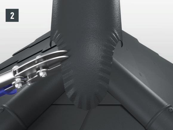 V območju stoječega vzgiba izrežite zgornji patentni zgib, tako da ostane zgib kavlja (sliki 1 in 2), in strešno ploščo R.16 ali strešni panel FX.12 upognite za 30 mm pod pravim kotom glede na površino strehe.
