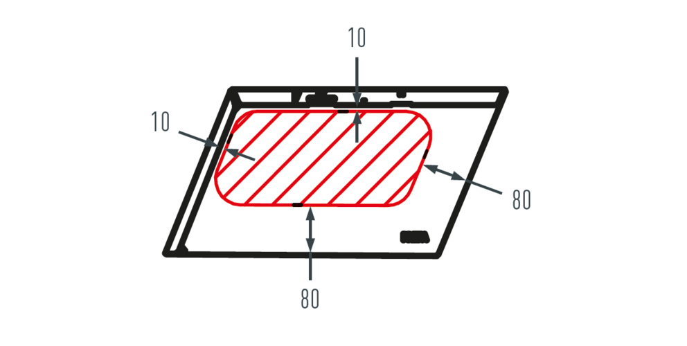 Pri montaži dodatnih strešnih izdelkov pazite na dovoljeno montažno območje na strešnih skodlah. Naslednja slika prikazuje montažno območje za dodatne izdelke na nožnih delih. Za druge dodatne izdelke so lahko določena drugačna montažna območja.