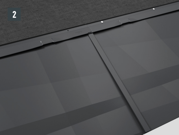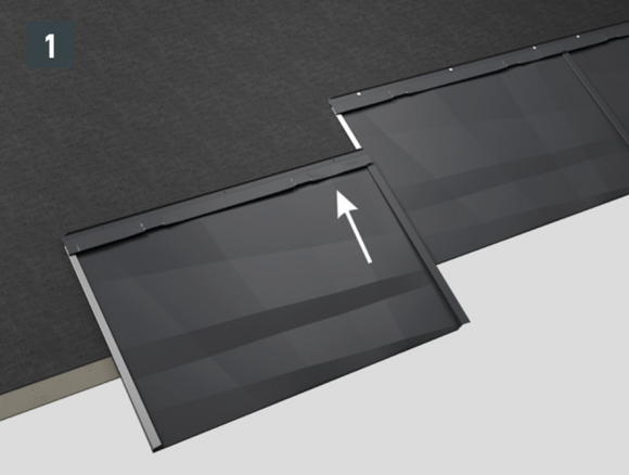 • Nastavite strešni panel FX.12 in ga potisnite v zgibe (sliki 1 in 2). Na spodnjem robu panela rahlo udarite z ročajem kladiva.