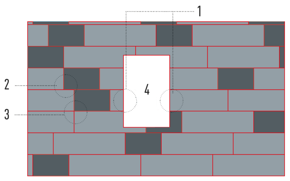 Odrezani panel FX.12 se ponovno uporabi na drugi strani odprtine (4) (1). Na ta način ni več zagotovljena pravilna razdelitev spoja (2) in lahko v najslabšem primeru privede do prekrivanja spojev (3). Zato so bili ustvarjeni primeri montaže za optimalen zamik spoja.