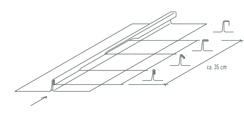 profilnem traku pomeni, da se bo trak neizogibno izbočil (glejte priročnik proizvajalca). Razmak med zgibi prilagodite glede na temperaturo polaganja: prevelik razmak med zgibi lahko pri uporabi stroja za zgibanje povzroči deformacije zaključnih zgibov in tako dvigovanje trakov. Premajhen razmak pa preprečuje prečno raztezanje.