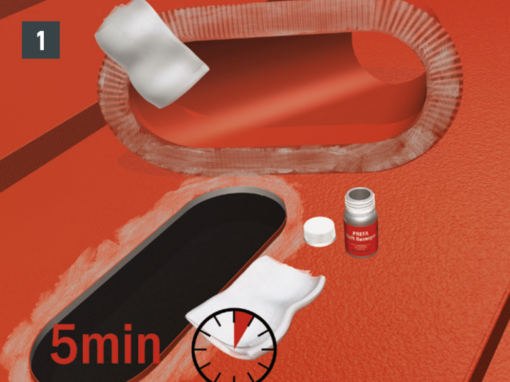 Lepljene površine je treba obrusiti (npr. z brusnim papirjem) in nato temeljito očistiti s čistilnim sredstvom za pritrjevala PREFA. Površine morajo biti suhe, čiste in razmaščene.