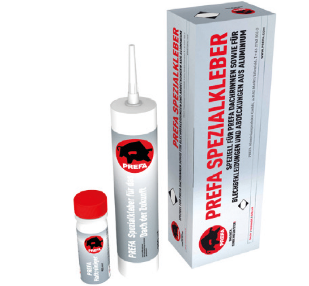 S priročnim kompletom posebnega lepila PREFA je mogoče trajno in zanesljivo izdelati obrobe za lepljenje ter spoje pri nadstrešnih in visečih žlebovih. Bistvena prednost je v naknadni vgradnji, ki jo je mogoče izvesti hitro, preprosto in brez zgibanja.