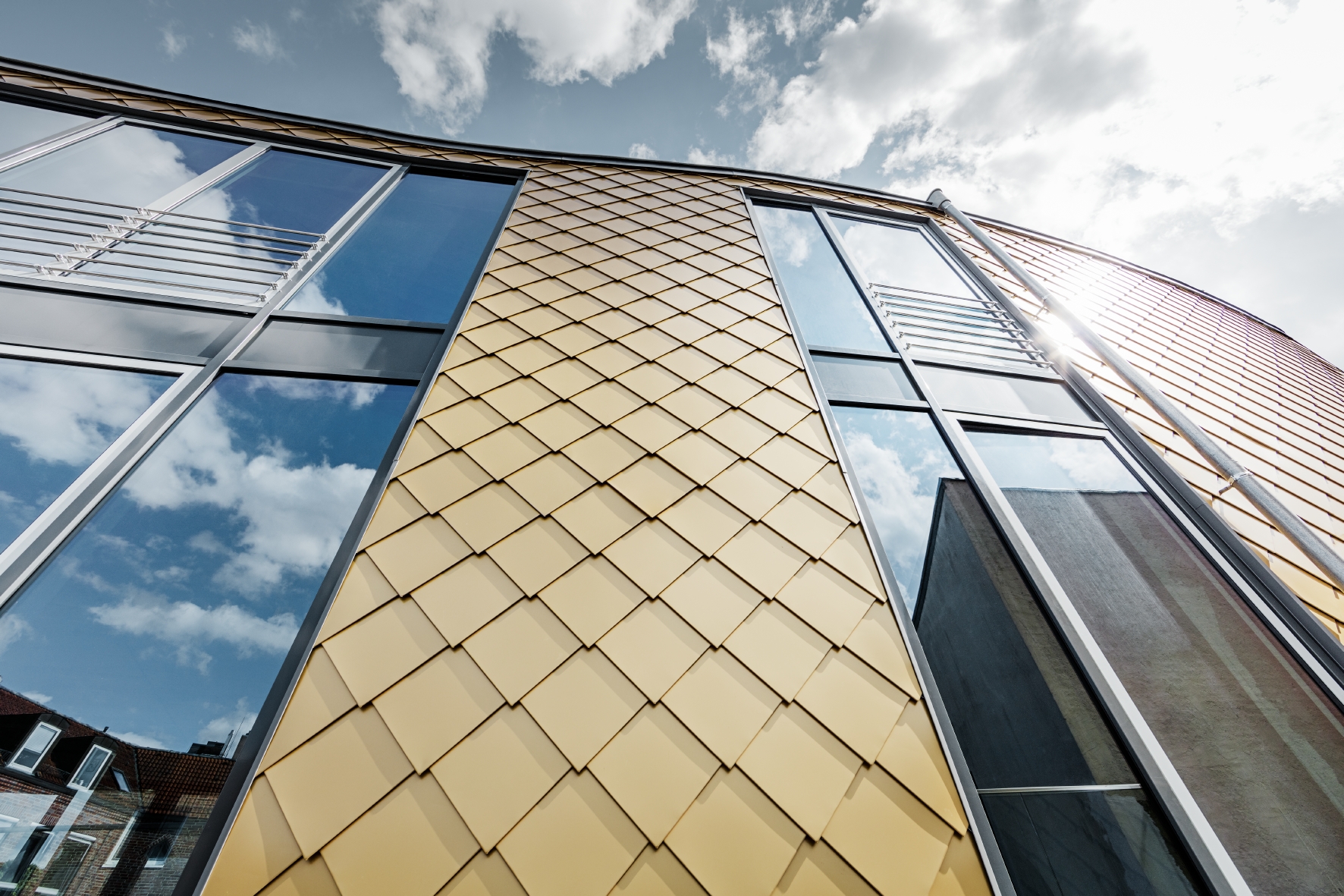 Les losanges 29 × 29 cm en aluminium couleur or de PREFA qui habillent la façade aux formes arrondies et la toiture aux multiples détails réalisée en Falzonal de PREFA se marient parfaitement avec la brique rouge traditionnelle, formant un ensemble à la fois original et esthétique.