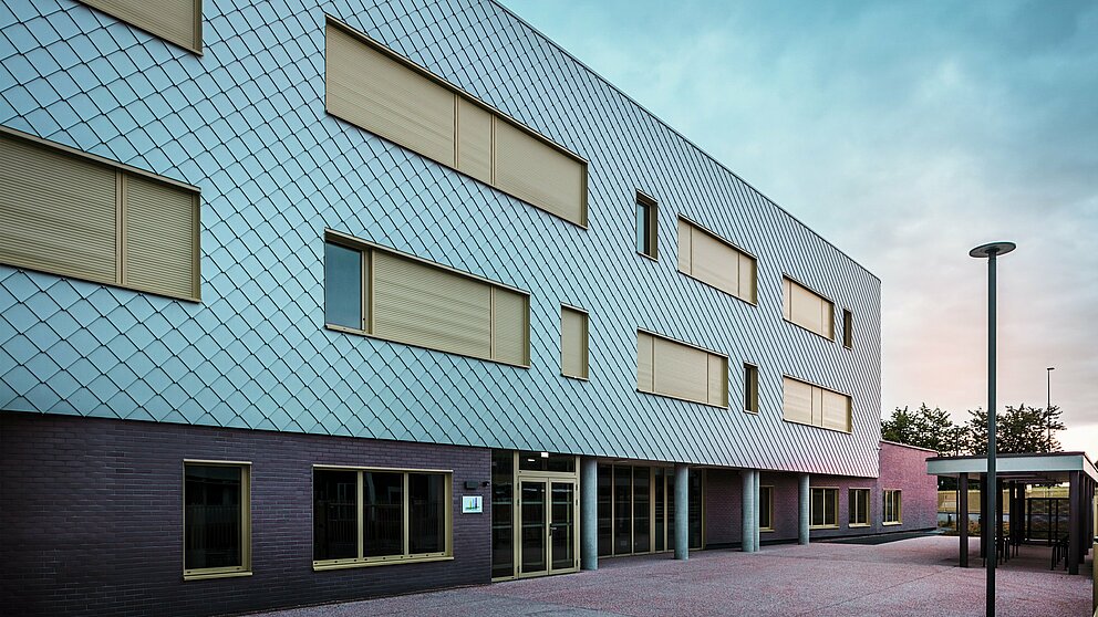 Pri biroju CLARC imajo vse odločitve tudi pragmatično ozadje. Opečna fasada v pritličju je dovolj trpežna za šolski vsakdanjik, kjer žoge ali šolske torbe pogosto zadenejo zid. Aluminijasta fasada nad njo odbija svetlobo in daje vtis, da stavba skoraj lebdi. Tudi izbor barv ni podvržen trenutnim modnim trendom, saj mora šolska stavba delovati več desetletij.