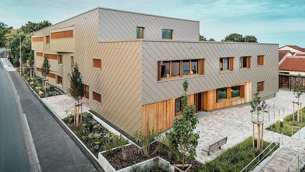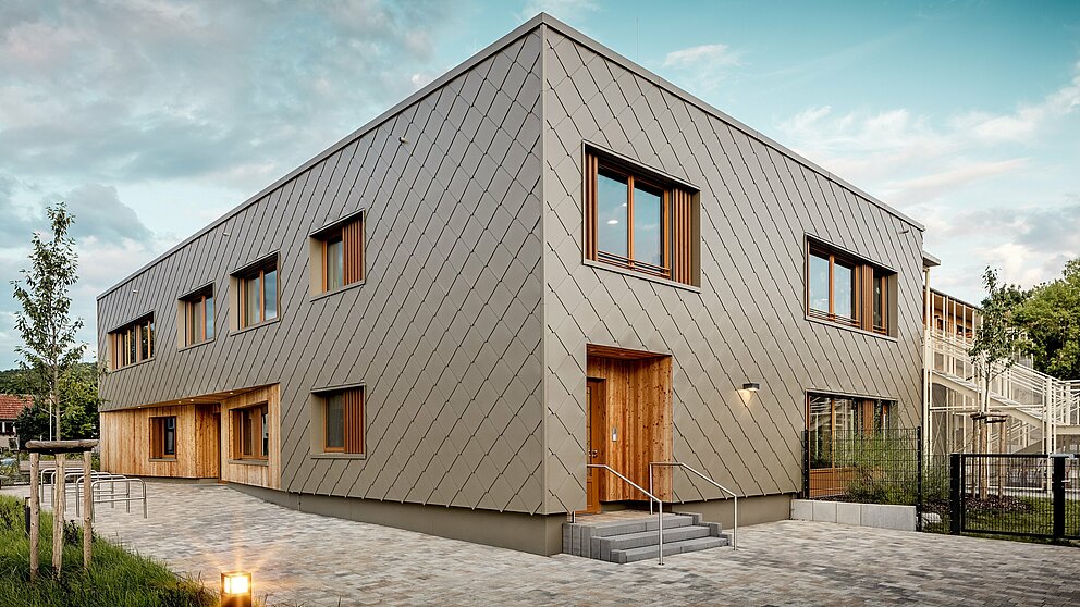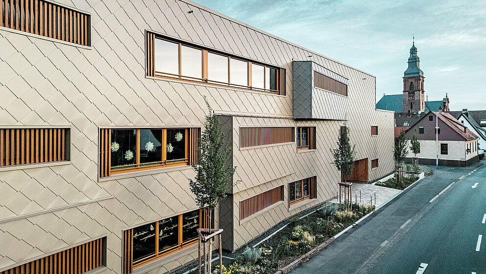 Izziv so predstavljale različne tlorisne geometrije in statični rastri, raznoliki poteki inštalacij ter prenos obremenitev prek spodnjih etaž. Obešena aluminijasta fasada iz PREFA fasadnih rombov 44 × 44 v bronasti barvi naj bi različna funkcionalna območja hibridne stavbe vizualno povezala v skladno celoto. »Če pogledamo celoten življenjski cikel, je PREFA preprosto vodilna glede porabe energije in reciklabilnosti,« fasadni sistem pohvali Claudia Härtner – zavedajoč se ekološke vrednosti gradbenih materialov, ki varčujejo z viri in so klimatsko aktivni, kar pa je treba vedno presojati v kontekstu konkretnega mesta uporabe.