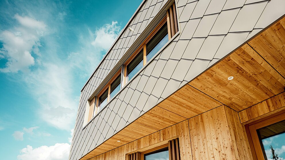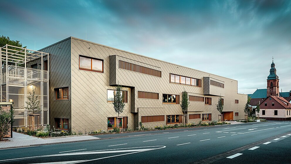 Bronasto aluminijasto oblogo je okoli stavbe namestilo kleparsko podjetje ASA Schüßler. To frankovsko tradicionalno podjetje je v Alzenauu že uspešno realiziralo drugi projekt PREFARENZEN. Za hibridno stavbo je bilo nameščenih približno 3.500 PREFA fasadnih rombov velikosti 44 × 44 centimetrov v bronasti barvi – vsak posamezno pritrjen na leseni polni opaž s PREFA narebričenimi žičniki. Številni vogali in okvirji objekta so obdelani z žepnimi profili in standardnimi kotnimi elementi.