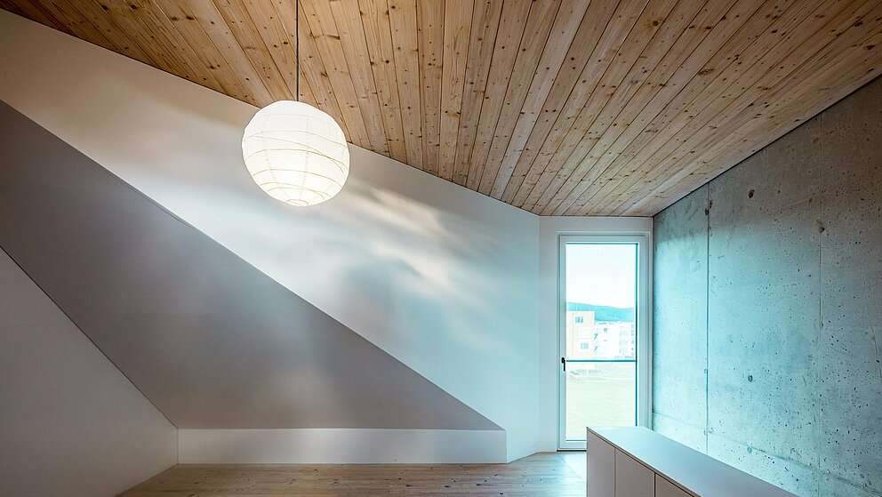 S svojo monolitno obliko in enobarvno belo fasado ta opazna hiša na vogalu izraža purizem v geometrijski popolnosti. Dva stavbna volumna – eden z ravno streho, drugi s poševno – se stikata v obliki črke L ter tvorita zaščiten notranji atrij s pokrito teraso. Klasičnih strešnih napuščev ni, namesto njih pa so poudarjeni zaključni robovi na čelih, napuščih in atiki. V notranjosti se nekateri prostori odpirajo vse do strehe in skozi skrbno umeščena okna usmerjajo pogled v daljavo. Veliko frčadno okno osvetljuje globino prostorov. Brušena betonska tla, lesene površine iz svetle bele jelke ter bele glazure na lesu dajejo interierju elementarno jasnost in ustvarjajo zatočišče miru.