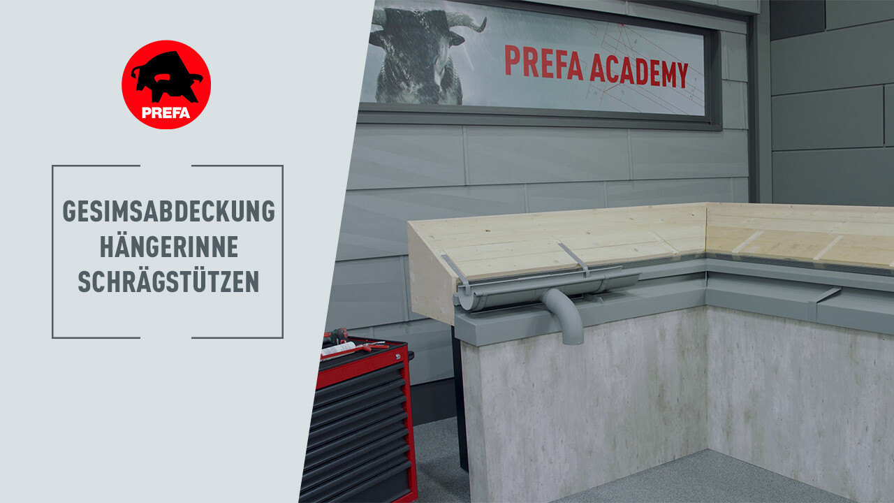 In diesem Video wird die Montage des Schrägstutzens der PREFA Hängerinne bei einer Gesimsabdeckung gezeigt.
